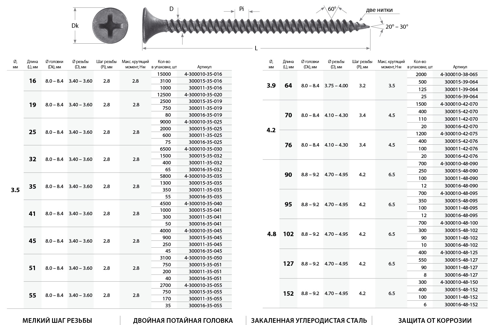 Отличие между размерами Размеры отличаются только длинной и диаметром, чем длиннее саморез, тем толще диаметр, тем саморез прочнее.